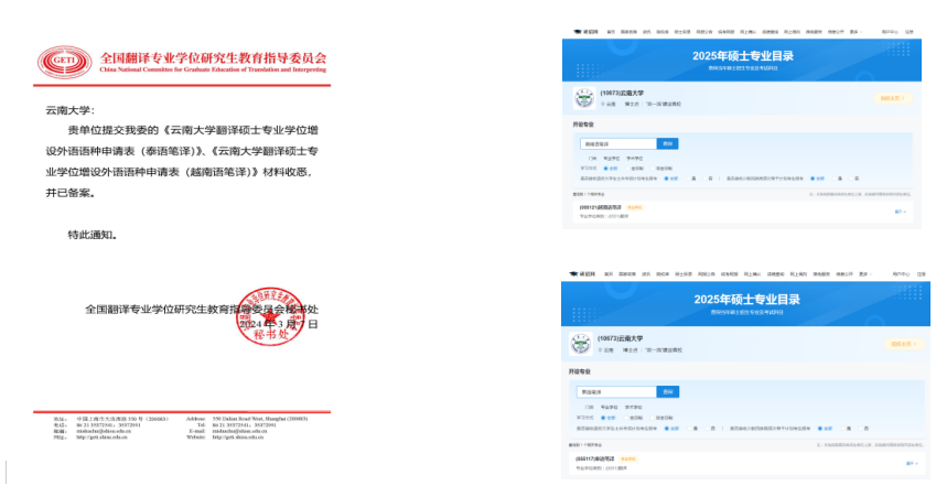 2024年3月,收到全国翻译专业学位研究生教育指导委员会秘书处回复,新增泰语专业笔译方向(代码055117)、越南语专业笔译方向(代码055121)的申请获准备案。在大学研究生院的指导下,开元网页版登录入口已将以上两个专业方向列入2025年招生计划,实现了首次招生,是开元网页版登录入口非通语种专业取得的突破性发展,为云南大学下一轮“双一流”建设做出了应有的贡献。