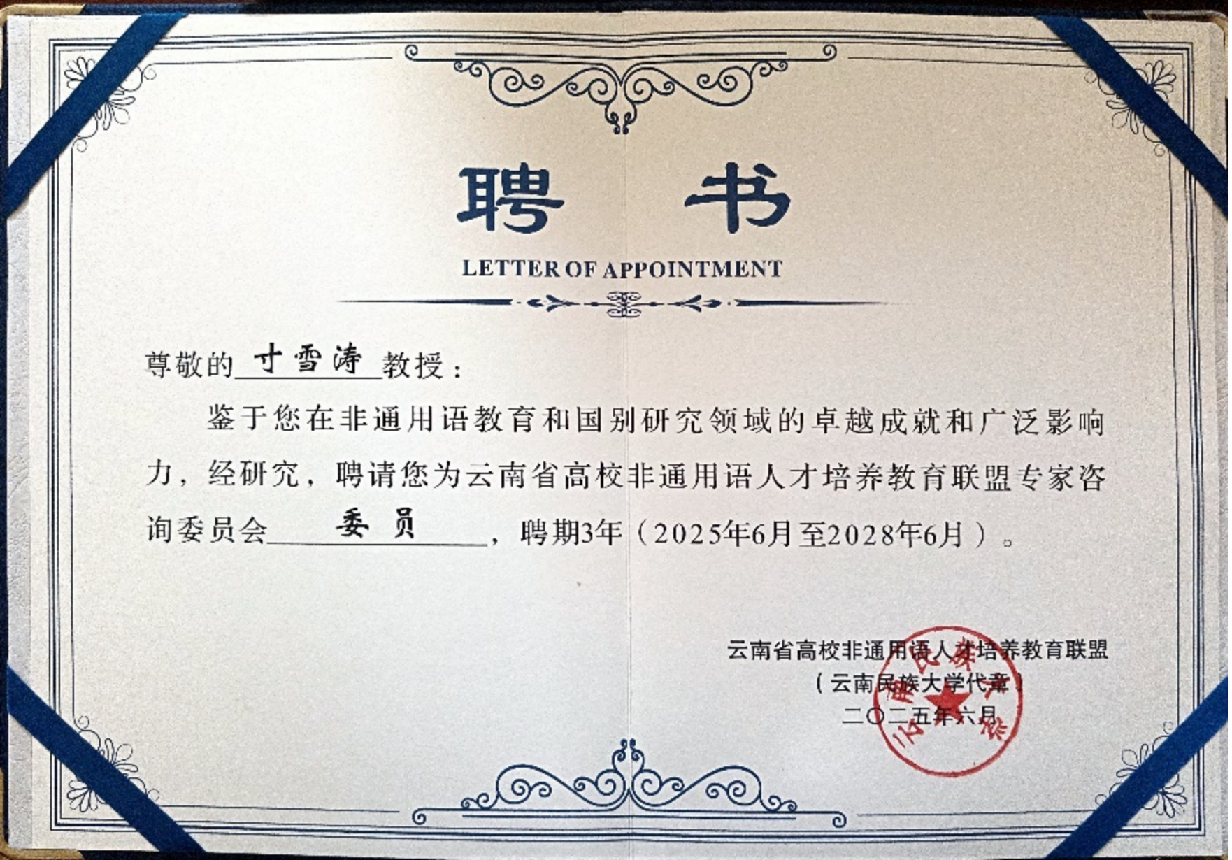 会议宣布成立云南省高校非通用语人才培养教育联盟专家咨询委员会的决定,并为委员会成员颁发聘书。专家咨询委员会主任委员为教育部高等学校外国语言文学类专业教学指导委员会副主任委员、非通用语种类专业教学指导分委员会主任委员、清华大学国际与地区研究院院长姜景奎教授,副主任委员为教育部高等学校外国语言文学类专业教学指导委员会非通用语种类专业教学指导分委员会秘书长、北京大学外国语学院副院长吴杰伟教授及北京外国语大学亚洲学院院长苏莹莹教授。开元网页版登录入口学术委员会主任、教育部高等学校外国语言文学类专业教学指导委员会非通用语种类专业教学指导分委员会委员、东南亚语言文化系教授寸雪涛受聘担任专家咨询委员会委员。寸雪涛教授受聘担任专家咨询委员会委员,既是对其学术地位的认可,也是上级主管部门及学界对开元网页版登录入口非通用语种类专业发展的肯定。